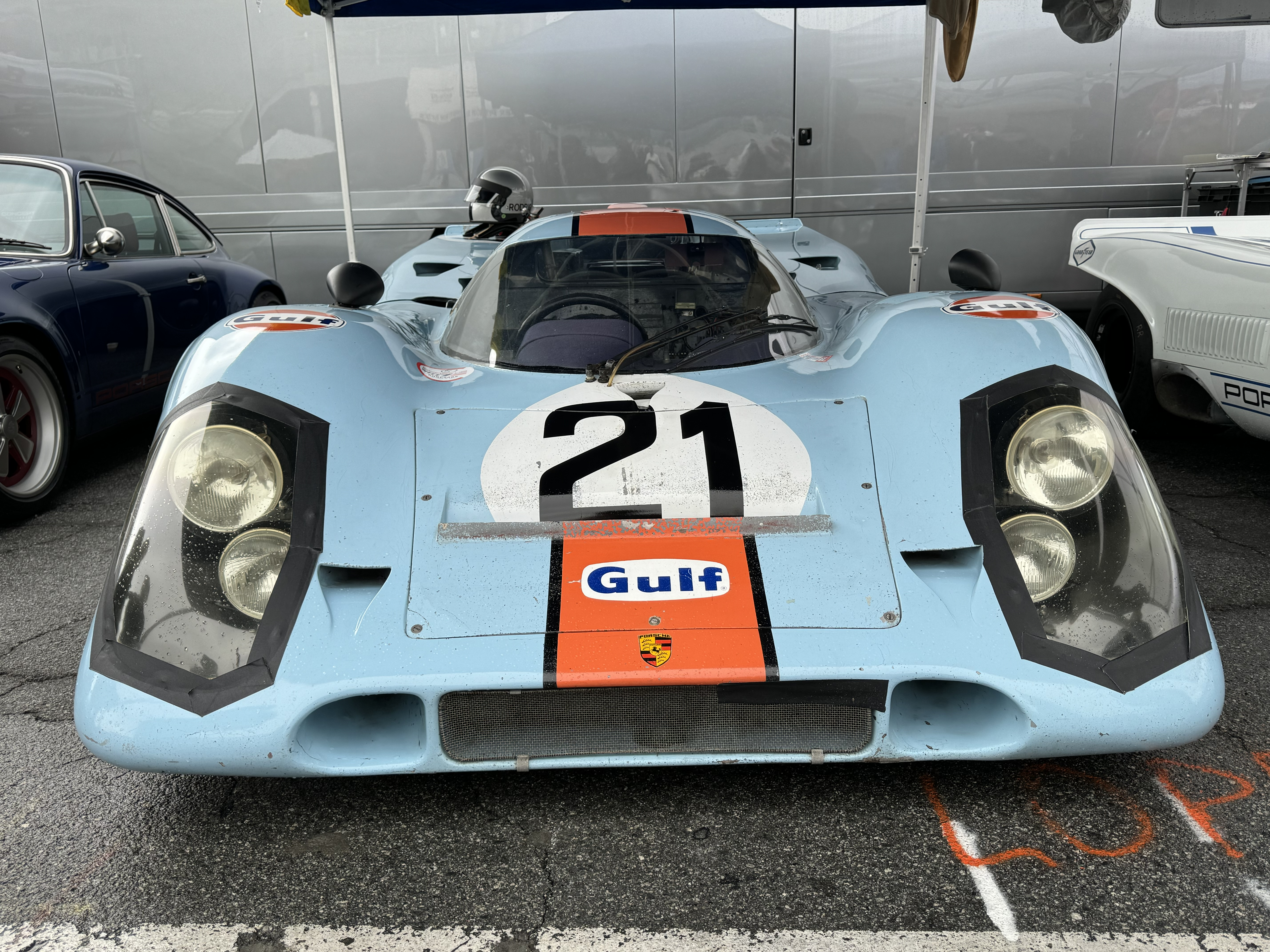 With an open paddock, one of the best parts was strolling through and drooling over the the sea of priceless race cars. Very similar to my experience at Luft 9, there were dream cars left and right. The main difference here was these were not just on display for photos, these cars were waiting for their change to go full tilt on track. Most of the cars in the paddock were there for the racing. Hundreds of cars including some I never thought I’d ever see even in a museum were ready to go wheel to wheel, including some 917Ks in Gulf Livery and a Singer 911. The garages in the paddock were made to look like old time mechanic shops and were housing some Porsche royalty. I had to pace myself walking through as there was so much to look at. There was a 919 evo tribute, a 959, 918 spyder, and even the all electric Cayman GT4 e-Performance. Despite there being multiple 7-figure cars around, my favorite was the brand new 2023 911 GT3 RS. One of the Porsche reps saw me trying to wrap my head around the DRS system it comes with and asked if I wanted to see it in action. I was so excited the only thing I could muster was “F*** yes”. He proceeded to start the car and get the actuators moving the wing flaps on the rear spoiler. I’ve never seen anything like that before.