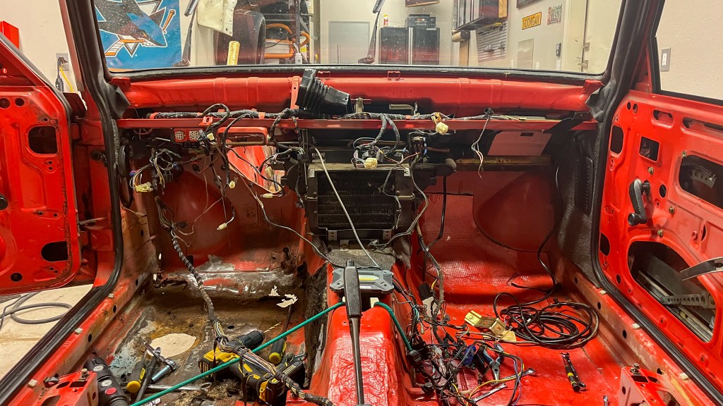 Under the carpet, under the sound deadening, and under my carefully constructed delusion that this car was “pretty solid,” I found rust. A lot of it. Like “is this still structurally sound?” levels of it. Front jacking points and floor pans on both sides, as well as a good chunk of the inner rocker panel, were all swiss-cheesed in a sea of crusty, crunchy, orange destruction. I stood there with the steam cleaner still running and just stared at it. There’s a moment every project car owner dreads where you wonder if it’s time to just walk away. This was mine. But after a little sulking and a lot of research, I decided I wasn’t ready to give up. I started ripped up the carpet and any panels to find where the rust ended. Unfortunately, that ended up being most of the interior as the rust was up into the front sills and would require a lot of cutting. In an effort to keep my interior from catching fire from all of the welding and grinding, most of it was removed.