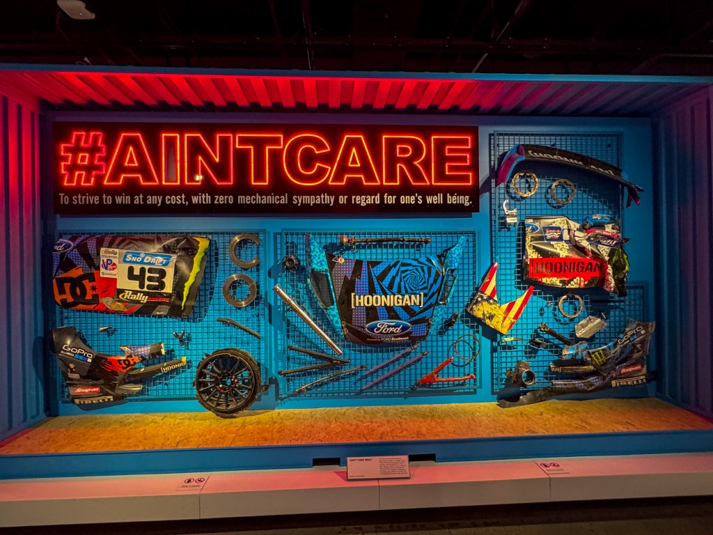 The non-automotive displays throughout the exhibit tell Ken’s story in ways the cars alone cannot. The “Ain’t Care Wall” immediately grabs your attention. A collection of broken suspension arms, destroyed wheels, and shattered bodywork pieces mounted like battle trophies, each showcasing his rally motto “To Strive to win at any cost, with zero mechanical sympathy or regard for one’s well being.” Each mangled component represents Ken’s fearless approach to everything he touched, a physical manifestation of his famous “ain’t care” attitude.