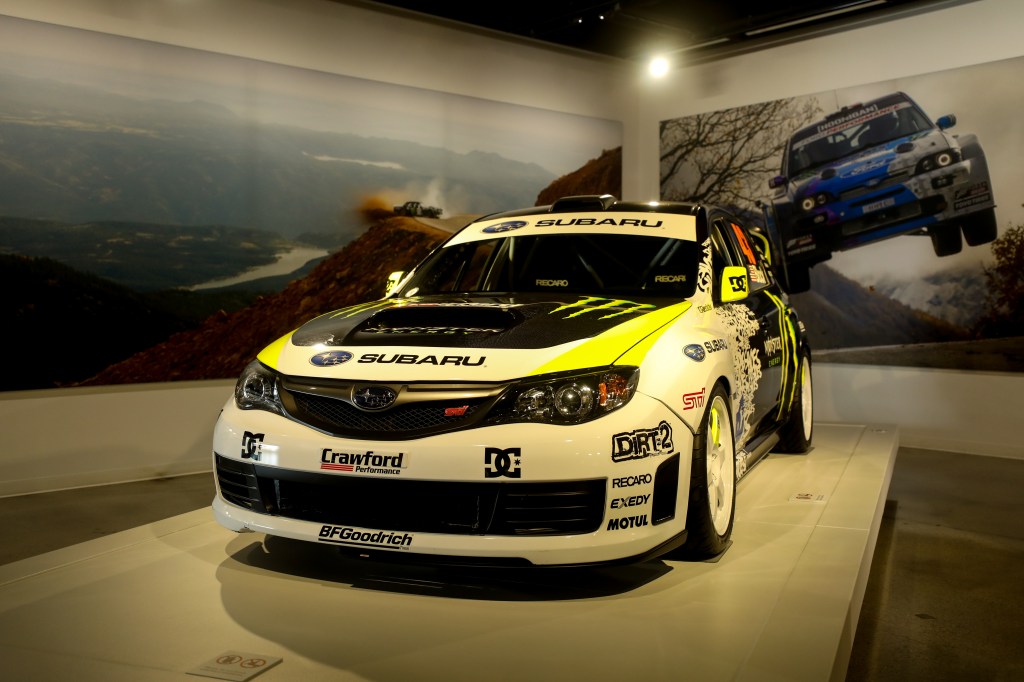 The heart of the exhibit showcases most of Ken’s most famous vehicles, each representing a different chapter in his remarkable career. The 2005 Subaru WRX STI from Gymkhana One sits prominently—this unassuming black and blue rally car generated over 17 million views and launched a revolution in automotive content. What started as a simple video of Ken throwing a Subaru sideways around an airfield became the blueprint for every car video that followed, not just his.