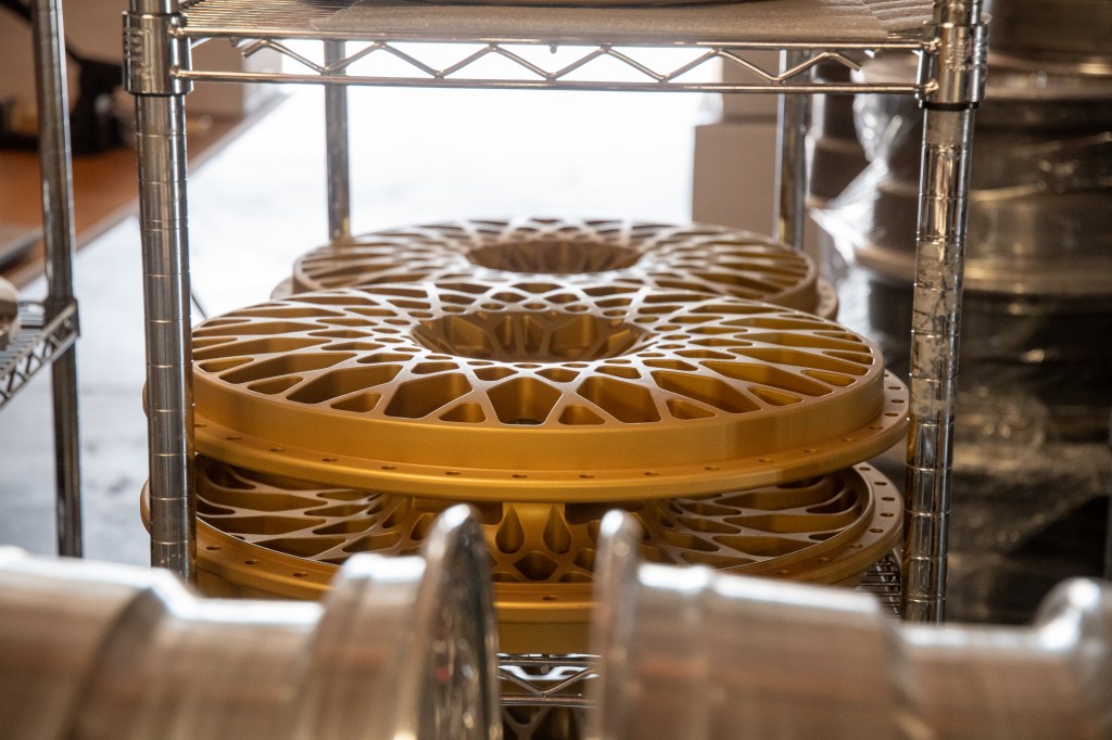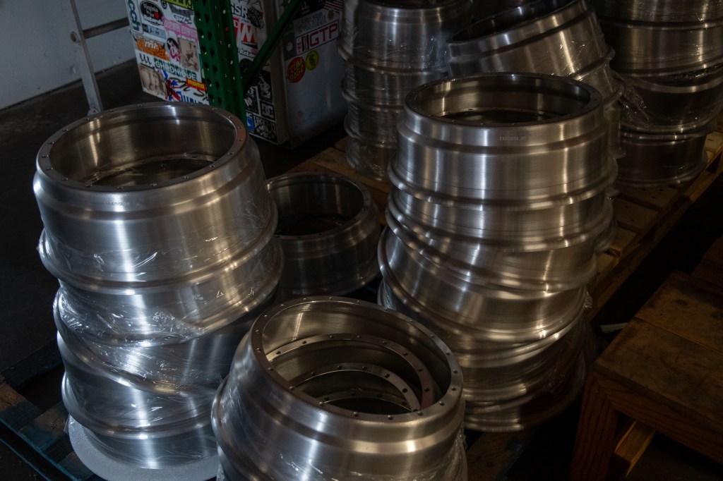 Wheel racks line the center of the shop, filled with recently machined faces waiting for assembly. Stacks of barrels in various stages of completion sit organized by order, some raw, others polished to a mirror finish, each tagged and ready for the next step in the process. In the corner, completed wheel sets sit wrapped on pallets, ready to ship out to customers who’ve been waiting for their custom builds.